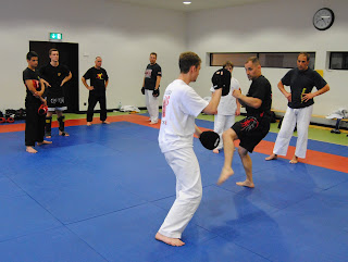 Im Dojo stand das Thema Pratzentraining auf dem Plan. Ich habe in der Einheit aus Schlag- und Trittkombinationen heraus den Übergang vom Stand in die Bodenlage genutzt, um schließlich am Boden weiter zu arbeiten. Dabei war mal der Pratzenhalter und mal sein Trainingspartner am Boden. Die Inhalte der Einheit finden sich wieder auf meiner Lehr DVD „Pratzentraining für Budo-Sportler„. |