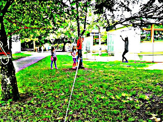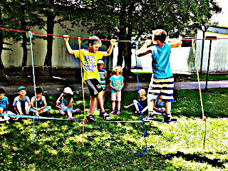 Ich habe auf dem Gelände zwischen unserem alten und neuen Pavillon Seilbrücken gespannt. Die unterschiedlichen Schwierigkeitsgrade haben große und kleine Kinder herausgefordert, manchmal haben sich auch die Eltern auf das Seil gewagt.
